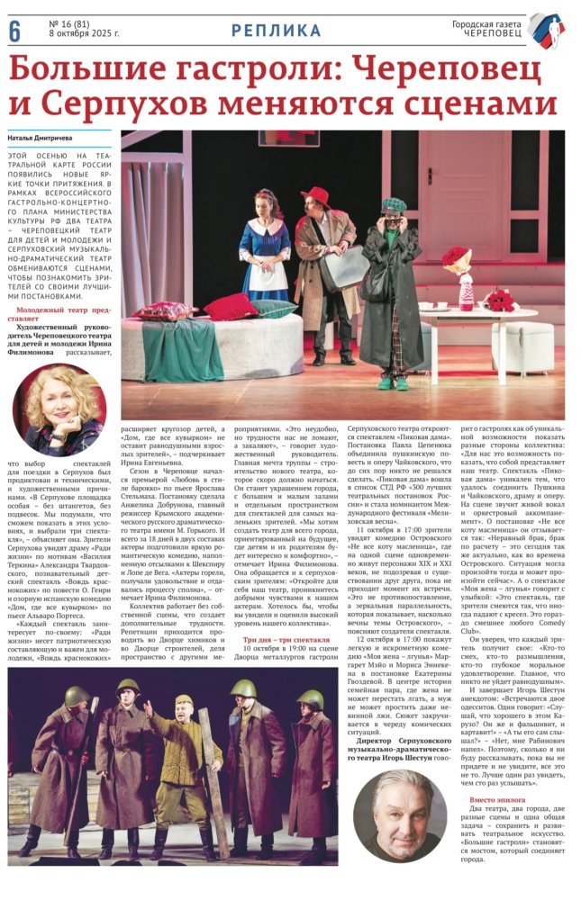 / Большие гастроли: Череповец и Серпухов меняются сценами. Городская газета.